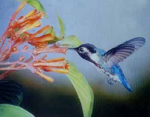 y se sostiene en un punto exacto del espacio gracias a la rápida vibración de sus alas. Cuando vuela, es muy difícil distinguirlas, y parece como si su cuerpo estuviera suspendido en el vacío mientras recoge el néctar. Esta rápida vibración, provoca un ruido tipo susurro.